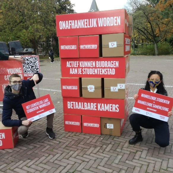 Actiecomité Wageningen bestaat uit een groep van 10 studenten die zich hard maken voor #NietMijnSchuld. Elke week of 2-wekelijks wordt er (online) vergaderd. Tijdens de vergadering worden ideeën met elkaar uitgewisseld en wordt er toegewerkt naar mooie acties, waarmee de rest van de Wageningse studenten bereikt worden! Actiecomité Wageningen heeft diverse acties georganiseerd, zoals de tenten-actie gericht op de hoge huurprijzen van studentenkamers en het levensechte Jenga-spel!